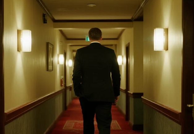 "Ding!" Doors slid open. Floor 33 greeted me with air thick with cleaner and perfume. Deep red carpet muffled my steps; dim sconces cast soft light. Rows of heavy doors resembled silent tombstones. Eerie stillness amplified my breaths. I shuffled forward, scanning gilt numbers: 3301...3303... My heart battered my ribs, throbbing at my temples.